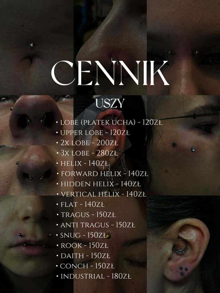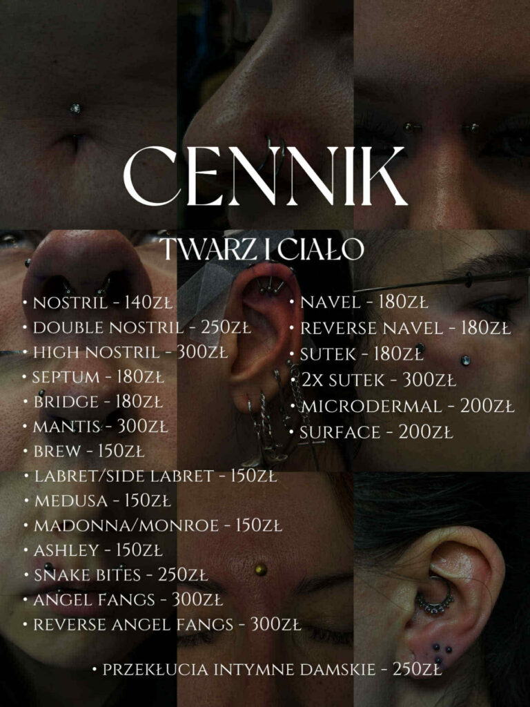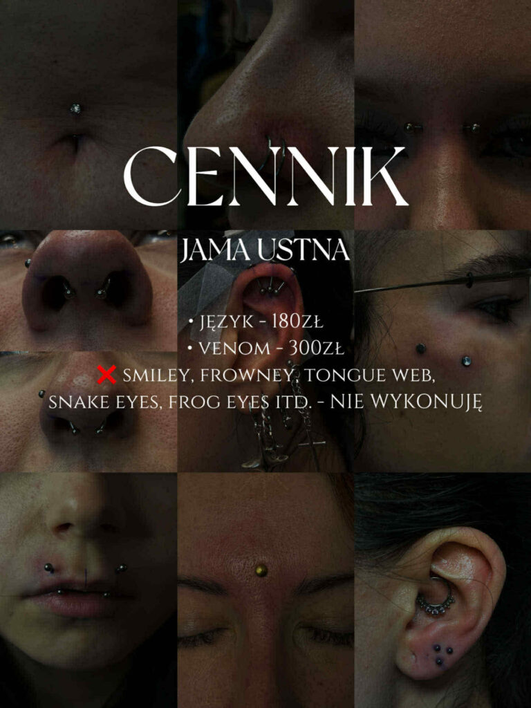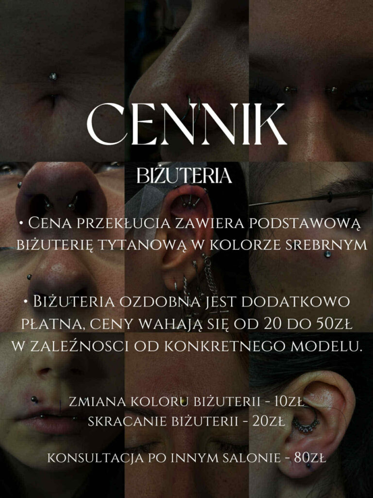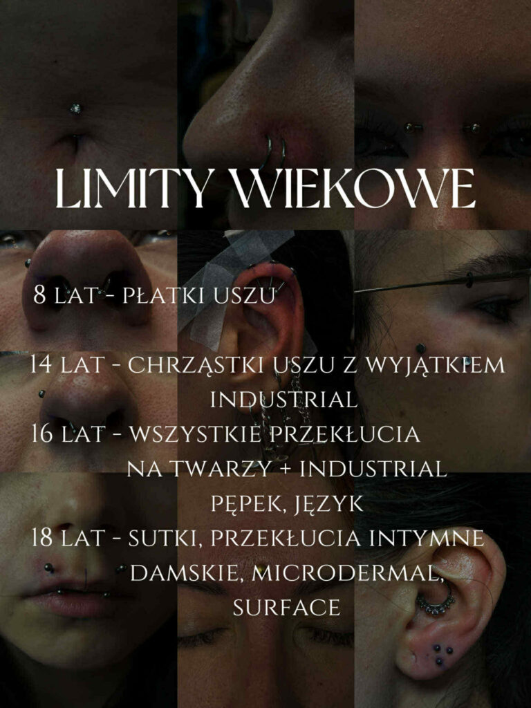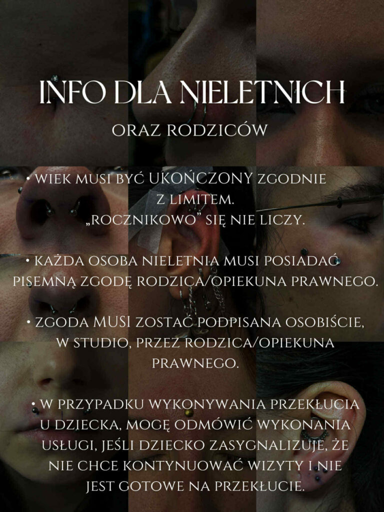 Używam jednorazowych igieł, szczypiec ze stali chirurgicznej poddanych sterylizacji lub jednorazowych szczypiec zapakowanych fabrycznie. Wysterylizowanych kolczyków wyłącznie z tytanu G23, ptfe, lub bioplastu (są one wliczone w cenę przekłucia). Nie wykonuje przekłuć pistoletem. Osoby, które nie ukończyły 18 roku życia, mogą skorzystać z naszych usług za zgodą prawnego opiekuna lub rodzica. Przekłucia wykonujemy wyłącznie osobom powyżej 16 roku życia.
